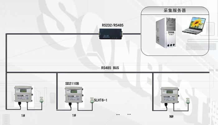 下图是基于SD2110B显示仪典型温湿度监测与控制的RS485组网结构图,每个SD2110B显示仪都有一个节点编号,一个小系统,可以放置1-15个SD2110B显示仪传感器。 因每个SD2110B显示仪采用宽电池供电,所以整个系统都可以采用总线供电的方案。