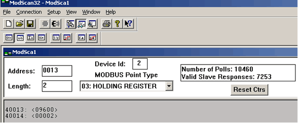 波特率及设备地址分别对应MODBUG-RTU协议中保持寄存器(Holding Register)地址40013,40014我们可以直接用MODBUS-RTU调试工具对此2个寄存器进行设置。40013为波特率,只有设置的值为“4800,9600,14400,19200”中任一个,设备才会识别。40014为设备地址,只有设置的值为1-250之间的任一值,设备才识别。更改设备地址的步骤:用MODBUS-RTU调试助手(以MODSCAN软件为例)或组态软件更改40013或40014值。