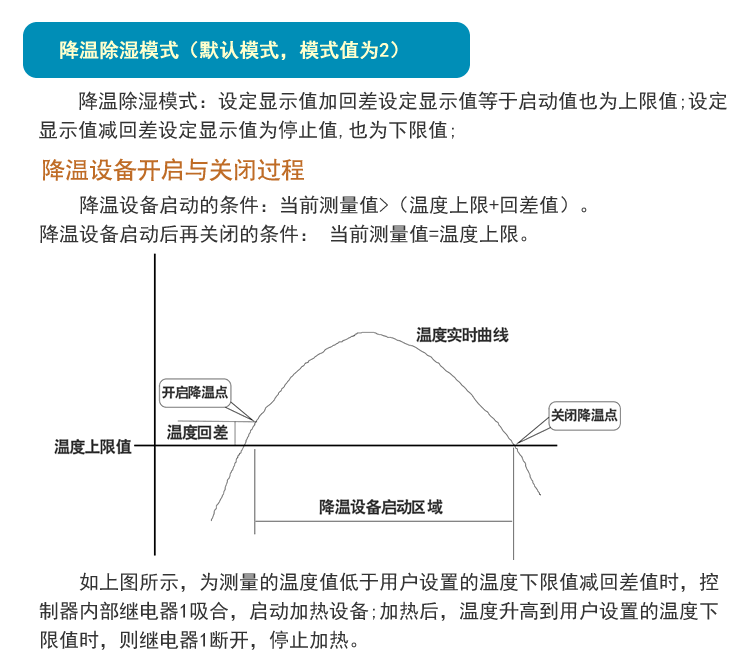 降温设备启动的条件:当前测量值>(温度上限+回差值)。