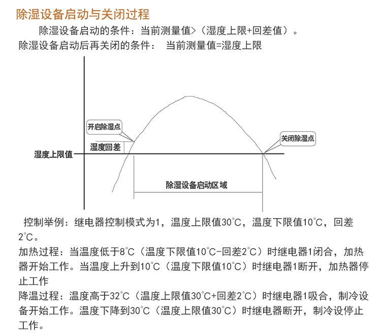 除湿设备启动的条件:当前测量值>(湿度上限+回差值)。