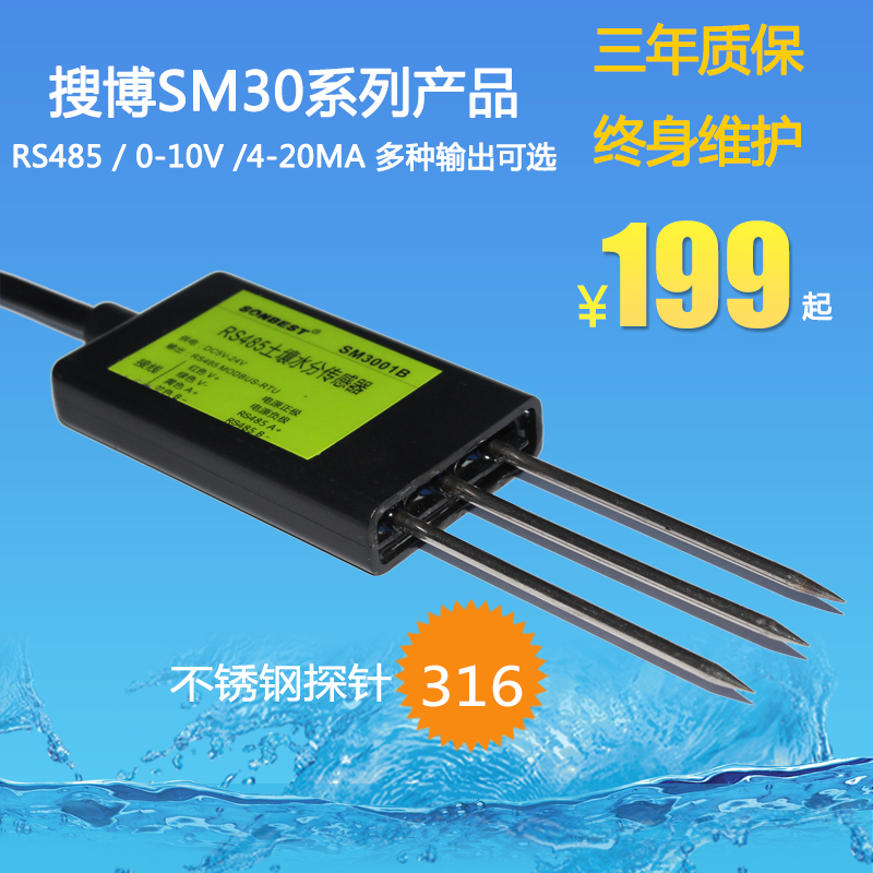 SM3001V2系列土壤水分传感器为可远距离传输的土壤水分传感器,可长期埋设于土壤和堤坝内使用,对表层和深层土壤进行墒情的定点监测和在线测量,也叫农田墒情检测仪。采用0-20mA、0-5V或RS485工业通用接口,可直接接入各种显示仪表,实现土壤水分监测。与数据采集器配合使用,可作为水分定点监测或移动测量的仪器。土壤的各种理化性状、地形的差异作用、气候变化和人为的土壤管理措施对土壤水分状况有不同的影响,地表特征与土壤水分状况也存在着依次的相关性。